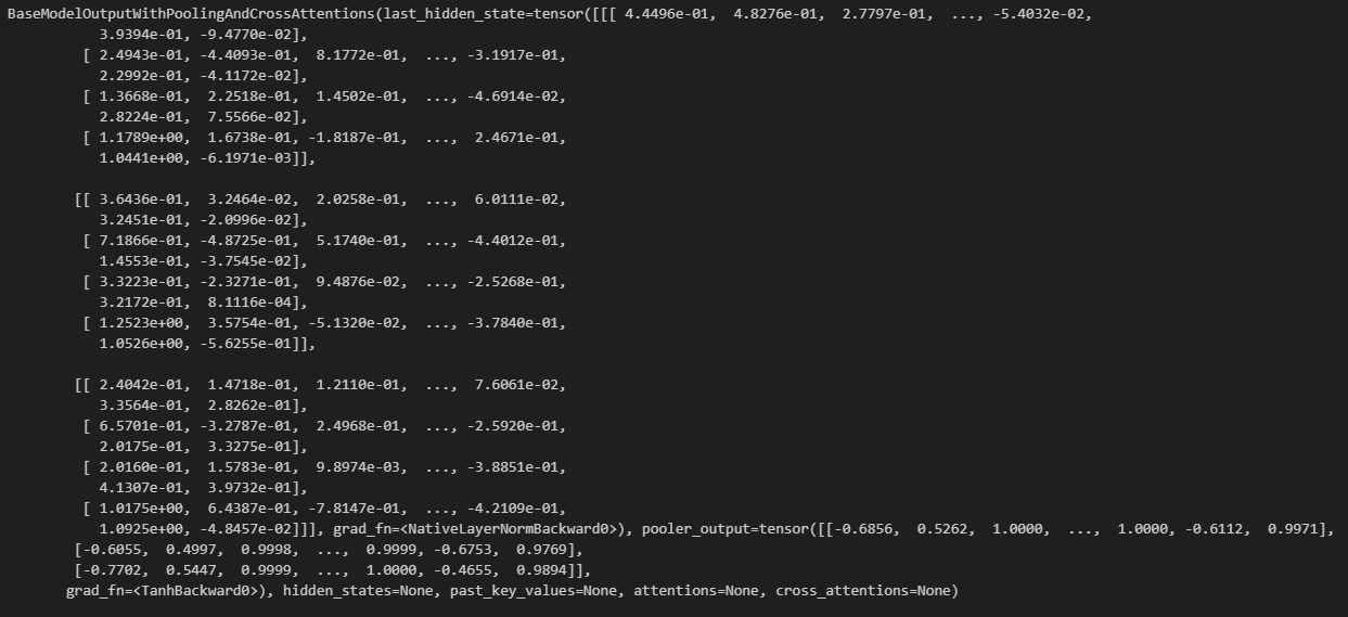 이 출력은 BERT 모델의 다양한 다운스트림 작업(예: 문장 분류, 토큰 분류, 질문 답변 등)에 사용될 수 있는 풍부한 표현을 제공합니다