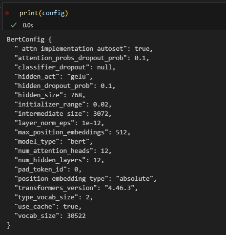 BERT 모델을 초기화하기 위해 가장 먼저 해야 할 일은 구성 개체를 로드하는 것입니다: