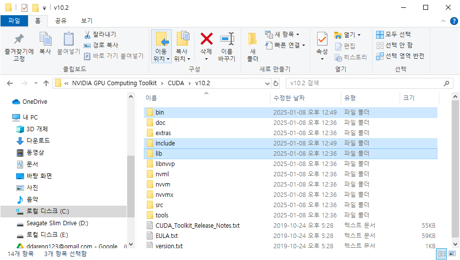 - 압축해제한 파일 (bin, include, lib) 을 CUDA Toolkit이 설치된 아래의 경로에 복사해서 넣어준다.