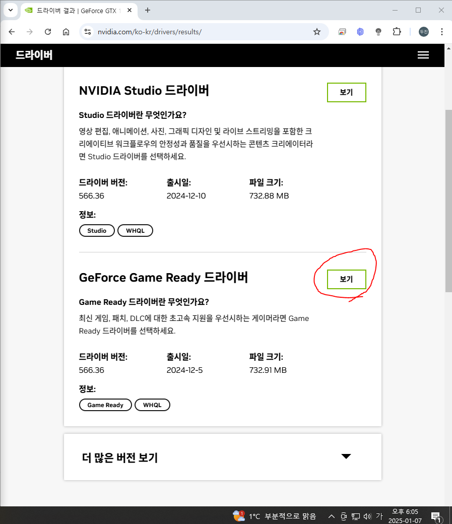 - "GeForce Game Ready 드라이버" 의 "보기" 클릭