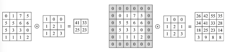 패딩은 아래 그림과 같이 입력 이미지의 가장자리에 특정 값으로 설절된 픽셀들을 추가함으로써 입력 이미지와 출력 이미지의 크기를 같거나 비슷하게 만드는 역할을 수행합니다. 이미지의 가장자리에 0의 값을 갖는 픽셀을 추가하는 것을 zero-padding 이라고 하며, CSS에서는 주로 zero-padding 을 사용합니다.