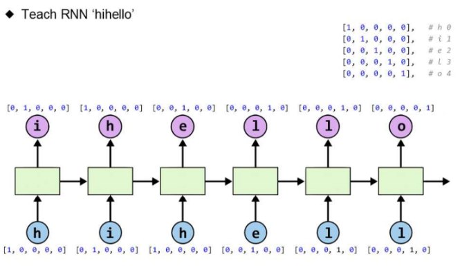 - "hihello" 단어의 각 문자별, idx2char 리스트의 인덱스위치 값 가져오기