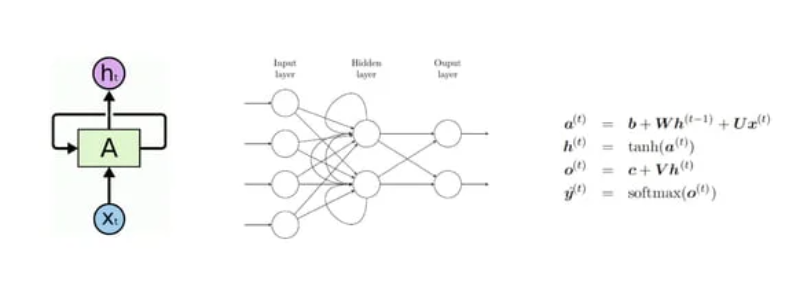은닉층의 노드 값을 t+1 시점으로 넘겨주고, t+1 시점의 입력을 받아서 계산하는 작업을 반복적으로 진행하여, "Recurrent" 이름이 붙었습니다. 반복적으로 진행되는 구조를 축약하여 위 그림의 우측처럼 나타낼 수도 있습니다.