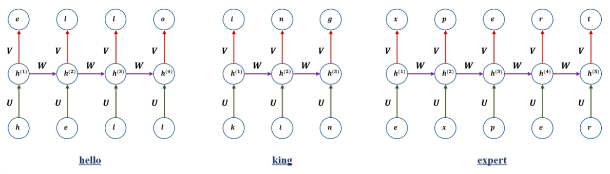 가중치를 공유하면 모든 edge에 가중치를 다르게 주는 것보다 학습할 가중치가 줄어도는 것을 직관적으로 알 수 있습니다. 데이터 별 시간의 길이 T에 유연함을 이해하기 위해서, 단어를 완성해주는 RNN을 고려해 보겠습니다.