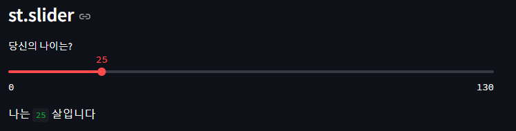 age = st.slider('당신의 나이는?', 0, 130, 25)
