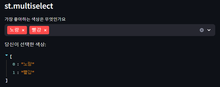 - st.multiselect : 여러 항목을 선택할 수 있는 위젯을 표시
